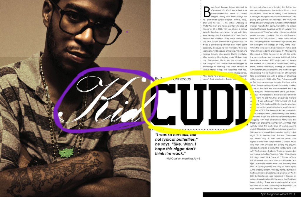 The purpose of this blog post is to show how the above magazine spread represents a good use of typeface & photography. This photo is of musical artist Kid Cudi, and the article is by Sean Fennessey, and this is the link for where I found the spread . I will point out how it uses different typeface categories, contrast in the typefaces, and how the photograph uses the rule of thirds.